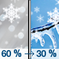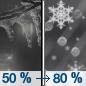 Sunrise 6:59 am Freezing rain and sleet likely before 3pm, then a slight chance of snow showers between 3pm and 5pm. Mostly cloudy, with a high near 26. North northwest wind around 10 mph, with gusts as high as 20 mph. Chance of precipitation is 60%.