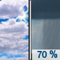 Sunrise 6:24 am Showers likely and possibly a thunderstorm after 1pm. Mostly cloudy, with a high near 82. South southwest wind 10 to 15 mph becoming west in the afternoon. Winds could gust as high as 20 mph. Chance of precipitation is 70%. New rainfall amounts between a quarter and half of an inch possible.